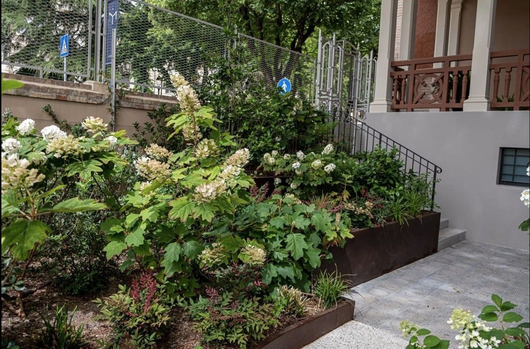 Abbiamo provveduto a fioriere in acciaio corten, pavimentazioni drenanti, impianto di irrigazione e naturalmente la messa a dimora di tante piante e arbusti.